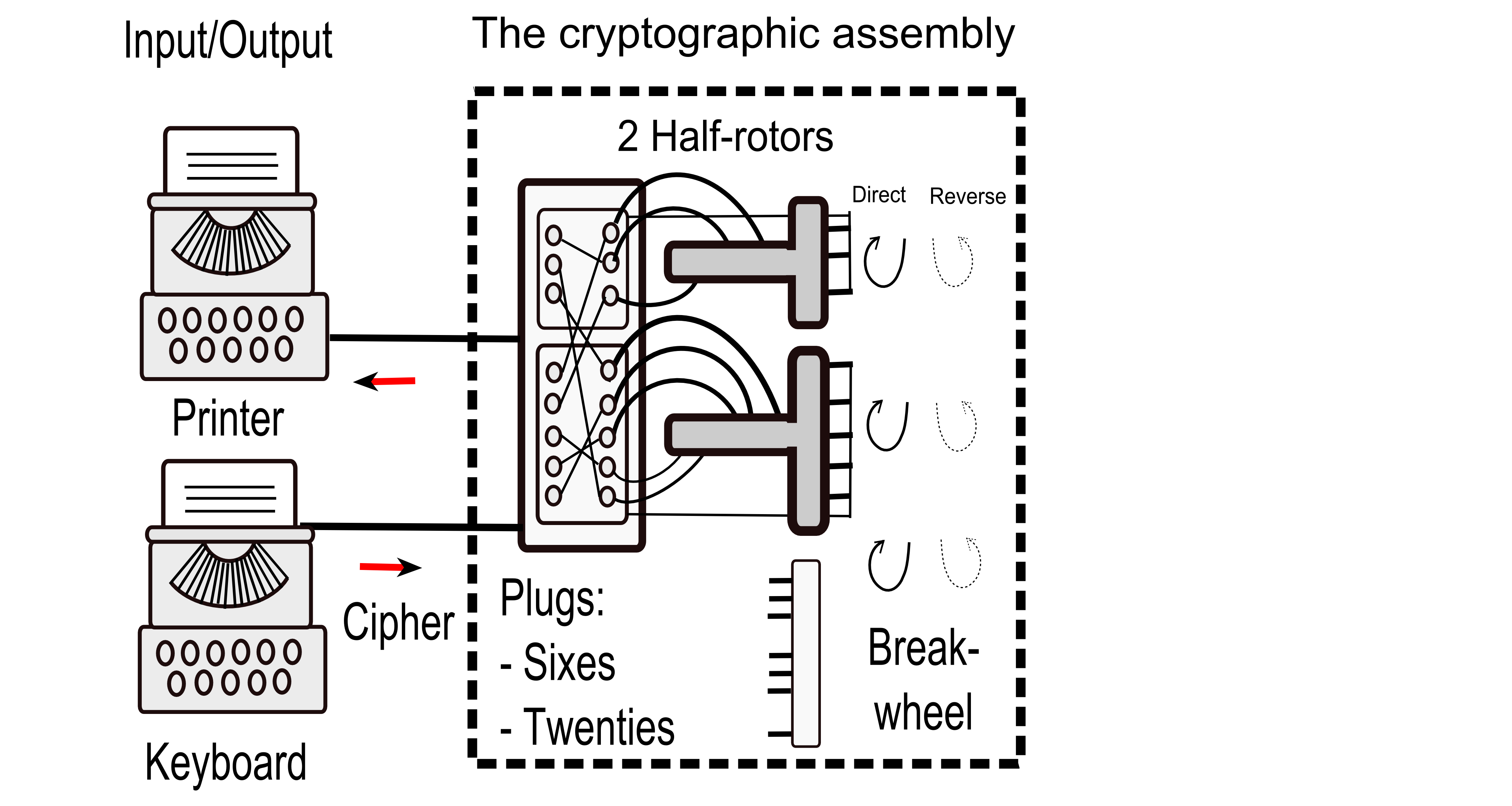 Rowlett's description of the operation of the RED cipher machineNote: Rowlett calls commutator what we call half-rotor.From a crytanalytic viewpoint, the Japanese diplomatic cipher machine system was composed of three distinct subsystems. One of these was the machine itself, which automatically performed the enciphering and deciphering processes. It consisted of a typewriter keyboard, a cryptographic mechanism, and a printing apparatus. Altough we never saw a model of the RED machine, we suspect that the Japanese had constructed the keyboard and printing mechanism from commercially produced typewriters which they modified to perform the input and output functions of the device. The little evidence that we developed from the few intercepts that discussed the operation of the device, and from our observations based on our analysis of it as well as the practices followed by the Japanese code room personnel in using it, led us to believe that the cryptographic mechanism was uniquely developed and constructed by the Japanese. As we visualized it, the cryptographic mechanism consisted of a pair of electrical commutators which were geared together and which stepped either forward (direct mode) or backward (reverse mode) with the encipherment of each letter of the message. The movement of these two commutators was controlled by a mechanism which at intervals introduced additional steps into the movement pattern of the commutators. The cryptographic component was also provided with a plugboard and plug arrangement from which twenty-six pairs of wires led to the keyboard and printing components. This plugboard arrangement allowed the connections between the keyboard and printer to be changed manually by the code-room personnel and was an important keying element in the security of the device. A means was also provided for switching the device from the enciphering mode to the deciphering mode and vice versa. ... With the machine set in the enciphering mode, the first letter of the message was enciphered by depressing the key on the keyboard corresponding to it. This sent an electical impulse through the plugboard into the commutating mechanism. There it caused the appropriate solenoid to operate, automatically recording the cipher equivalent. On release of the key, the cryptographic mechanism would automatically advance so that a solenoids of the printing mechanism. To encipher the second letter of the message, the key corresponding to it was depressed and its equivalent was automatically recorded; when the key was released, the commutators again advanced to a new position. This process was continued until all the letters of the message wre enciphered. To decipher the message, the plugboard sequence and the settings of the commutators and the stepping mechanism had to be exactly the same as those used for its encipherment, except that the machine had to be orperated in the decipherment mode. Some detailsThe Electrical CircuitThe electrical current starts at the keyboard (which could be a typewriter keyboard). It then arrives at a first plugboard (the input plugboard). The current output goes to one or the other of the two half-rotors. Let's say the current arrives at the first letter of the Sixes. After the Sixes half-rotor, the current exits at the input of the second plugboard, which is wired exactly as the inverse of the first. The current arrives (for example) at the second letter of the Sixes, which exits from the second plugboard (for example) as the fifth letter of the Twenties, and ends up on the light board (or the printer part of a second typewriter). In fact, the two logical plugboards are easily the inverse of each other because they correspond to a single physical plugboard. Each plug contains two cables: one belonging to the first logic plugboard (which carries current from one input/output device to the input of a half-rotor), the other belonging to the second logic plugboard (which carries current from the output of one half-rotor to the other input/output device). A lever is located between the input/output devices (which are typewriters in the case of the Japanese typewriter) and the physical plugboard. It allows the circuits to be switched to switch from encryption mode to decryption mode.