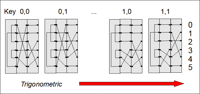 Using SympyIf you want to calculate the permutations shown in the drawings, you can use the following equations in Python with the Sympy library. >>> >>> P = Permutation([[0,1,2,3,4,5]]) >>> U = Permutation([2,5,0,4,3,1]) >>> N = Permutation([0,1,4,3,5,2]) >>> M = Permutation([5,1,2,3,0,4]) >>> def rot(j,i): ... left = ((P**i)*N*(P**-i))*((P**j)*M*(P**-j)) ... right = ((P**j)*~M*(P**-j))*((P**i)*~N*(P**-i)) ... return left * U * right ... >>> rot(0,0) Permutation(0, 1)(2, 5)(3, 4) >>> rot(0,1) Permutation(0, 4)(1, 5)(2, 3) >>> rot(1,0) Permutation(0, 5)(1, 3)(2, 4) >>> rot(1,1) Permutation(0, 2)(1, 4)(3, 5) >>> rot(2,0) Permutation(0, 3)(1, 4)(2, 5) >>> rot(2,1) Permutation(0, 1)(2, 3)(4, 5) >>> CryptanalysisWith the knowledge acquired here, mainly the mathematical vision of the Enigma, we will try to explain several methods of cryptanalysis and first of all the method used by Rejewski at the end of 1932 to find the wiring of the rotors of the Enigma used by the German army.