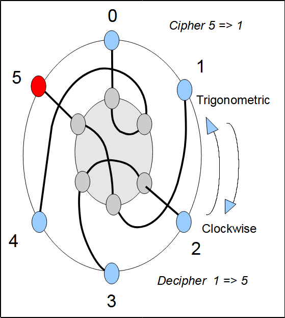 Figures 3 to 8 show the current flow in our simplified Enigma at the different positions of the rotor. The Enigma rotates in a trigonometry direction (counterclockwise). The operator looks at the machine seen perceptively from the right: first seeing the rotor and in the background the reflector. The red dot is attached to the rotor and allows its position to be materialized. Example of encryption: at position 2 of the rotor, if we encrypt 5 we obtain 2. At the rotor output 5 gives 5, then the reflector transforms the 5 into 3. The rotor crossed in the opposite direction transforms 3 into 2. Since encryption is equivalent to decryption, the encryption of 2 gives 5. Figure 9 shows the Enigma at various rotor positions, but unlike Figures 3 through 8, the Enigma is viewed from the side.