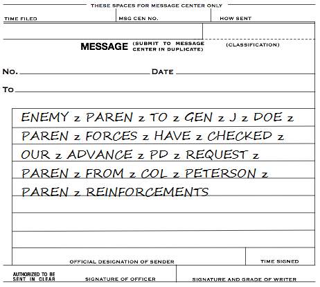 Then, he writes the abbreviated name of the means at the top of the message (RAD for Radio, TG for Telegraph, TP for Telephone, Pgn for Pigeon, Tt for Teletypewriter, Vis for Visual, Msgr for Messenger, ...). If the message is to be transmitted as a cryptogram, he passes the original of the message to the code clerk and files the duplicate copy in the live file. He gives the other copy to the messenger who returns it to the writer.